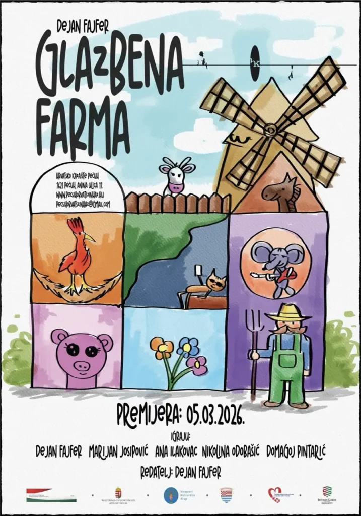 Farmi prijeti zatvaranje ali događa se nešto čarobno. Vjetar počinje šaptati, vrtjeti se i pjevati! Uz pomoć svog novog vjetrovitog prijatelja, životinje otkrivaju čistu, prirodnu energiju i uče kako surađivati kako bi spasile svoj dom. Ova radosna dječja kazališna predstava puna je glazbe, smijeha i ljupkih životinjskih likova.