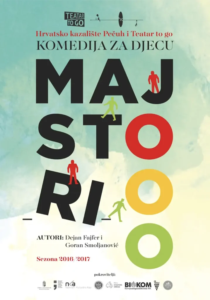 Predstava „Majstori“ donosi humor po uzoru na majstore slapstick komedije Charlia Chaplina i Bustera Keatona, odnosno komediju karaktera, zabune i situacije. Radnja se vrti oko dvojice majstora koji su dobili radni zadatak postaviti semafor za regulaciju prometa. Majstor Leopold je genijalac, ali samodopadan i hvalisav, a šegrt Ivek je radoznao, ali nespretan i lijen. Zbog svojih karakternih osobina upadaju u naizgled bezizlazne situacije i nevolje. Svjesni važnosti ispravno obavljenog posla služe se metodom pokušaja i pogreške čime potiču gledatelje na interakciju.