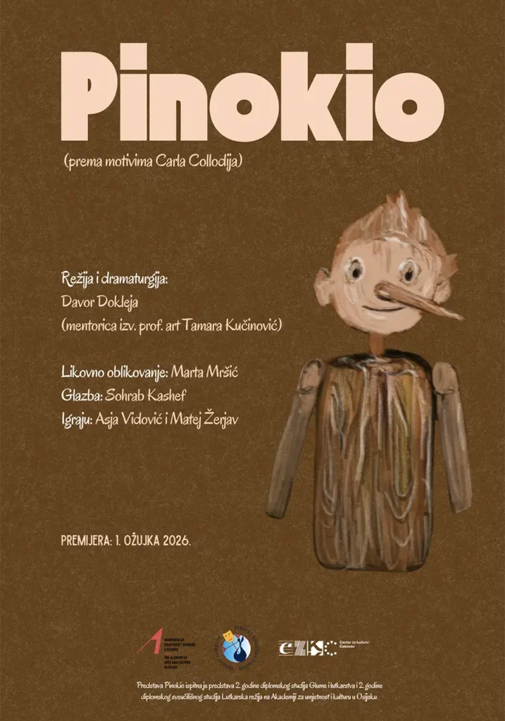 Svi znamo priču o majstoru Geppetu koji odluči napraviti dječaka Pinokija iz komada drveta. Iz jedne posebne cjepanice. No priča tu tek počinje. Kako se postaje čovjek? Što nas sve oblikuje, što sve utječe na nas i kako mi svim tim izazovima odolijevamo i još važnije kako na njih reagiramo. Pinokio na putu prema školi susreće vršnjačko nasilje, zabavu bez odgovornosti i brze načine zarade. Svaki događaj ima izbor i svaki izbor ima posljedicu, a svaka posljedica na njega ostavlja trag. Oblikuje ga. Predstava polazi od ideje da se čovjek ne postaje samim rođenjem. Njegova se duša gradi u odnosu prema drugima — u sposobnosti da vidiš drugoga, da osjetiš odgovornost, da priznaš pogrešku. Nije presudno od čega je netko načinjen, nego kako se odnosi prema drugima. Pinokio na kraju ne postaje čovjek zato što je bez pogreške, nego zato što preuzima odgovornost za ono što je učinio.