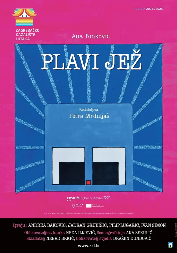 “„Plavi jež“ predstava je namijenjena djeci predškolskog i školskog uzrasta. Kroz priču o vjeverici udubljenoj u igricu, za koju virtualni jež postaje važniji od pravih prijatelja, djeca uče o važnosti sigurnosti na internetu i u online igricama. U današnje vrijeme, kada virtualni svjetovi odnose prevagu nad stvarnosti, važno je djeci poručiti da su prava prijateljstva i druženje važniji od zavodljivih digitalnih svjetova mašte, da se iza nadimaka i lažnih profilnih slika mogu kriti zlonamjerni ljudi i da se moraju odraslima obratiti za pomoć kada se nađu u nevolji.” Petra Mrduljaš